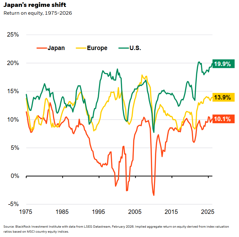 International developed market stocks are outperforming this year, after walloping U.S. counterparts last year. Is it too late to jump in? We don’t think so. Japan’s return on equity (ROE) has steadily moved higher, narrowing the gap with the U.S. and Europe. See the chart. This is not just a sugar rush from fiscal expansion. It’s very much a slow-burn, structural force: A focus on capital discipline and shareholder returns is lifting underlying profitability. Japanese companies are now focused on maximizing profits, rather than minimizing debt. And a steady decline in corporate cross-shareholdings is making Japan more attractive for foreign investors. In Europe, we think overall ROEs will need to improve via productivity gains – rather than being juiced by one-off cyclical boosts. We’re focused on sectoral opportunities in the region as a result.